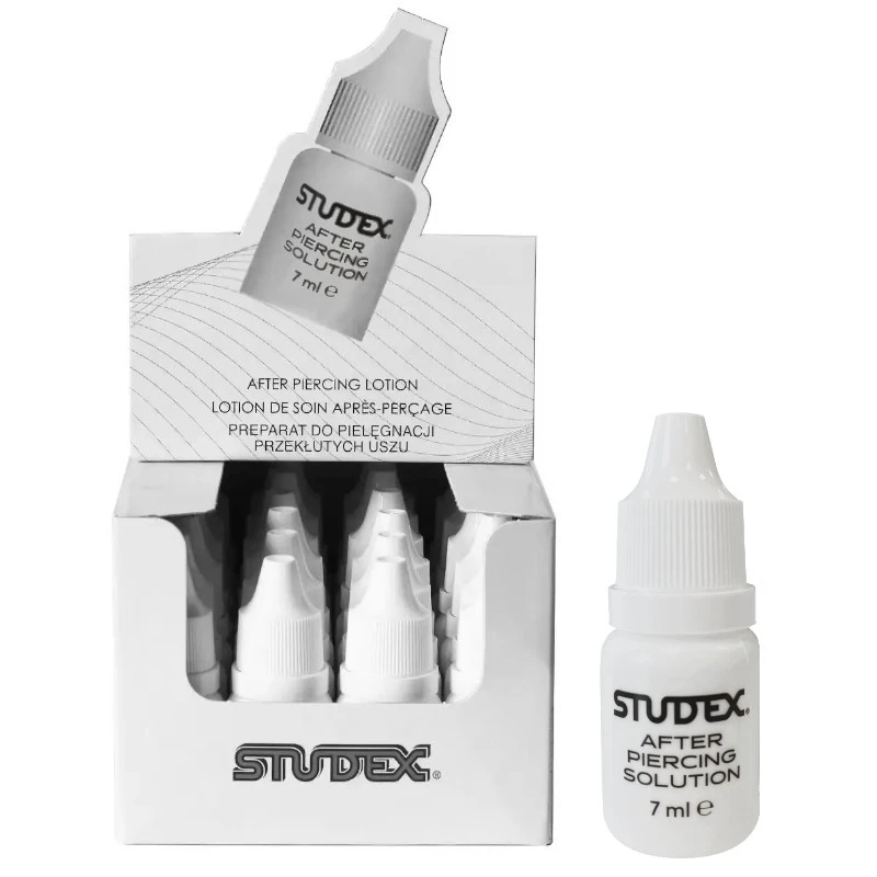 Zestaw 24 płynów do pielęgnacji uszu po przekłuciu marki Studex. Płyn zapobiega infekcjom oraz dezynfekuje skórę w miejscu przekłucia. Zaleca się przemywać przednią i tylną część ucha dwa razy dziennie, przekręcając każdy z kolczyków 2-3 razy o 180 stopni.