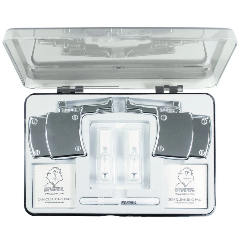Zestaw do przekłuwania uszu Studex System 75 zawiera: 2 aparaty, 2 kolczyki treningowe, 2 gaziki dezynfekcyjne i pisak chirurgiczny. Chromowany instrument jest bardzo lekki i bezgłośny, zapewnia pewny i wygodny uchwyt podczas zabiegu. Kanał, w którym umieszczany jest nabój z kolczykiem i zapinką, trzyma go mocno i stabilnie. Aparat gwarantuje sterylne przekłucia, podczas zabiegu nie dotyka ucha.