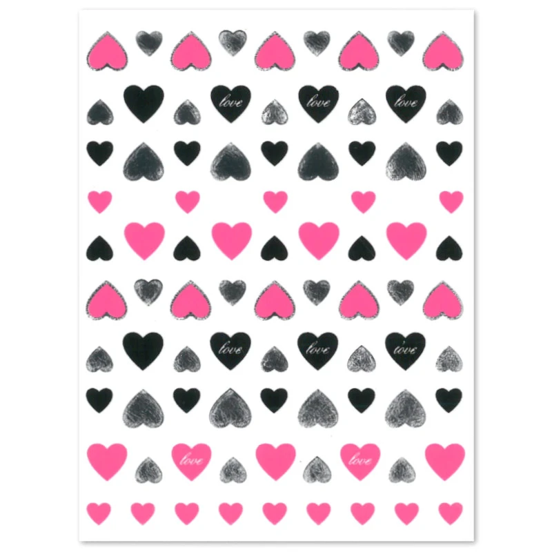 Cienkie naklejki samoprzylepne Love Nail Art Stickers utrzymane w walentynkowym, miłosnym klimacie, z różowymi, szarymi i czarnymi sercami. Sprawdzą się przy niemal każdej metodzie stylizacji paznokci. Cechuje je wysoka jakość. Stanowią szybki sposób na stworzenie pięknych wzorów na paznokciu.