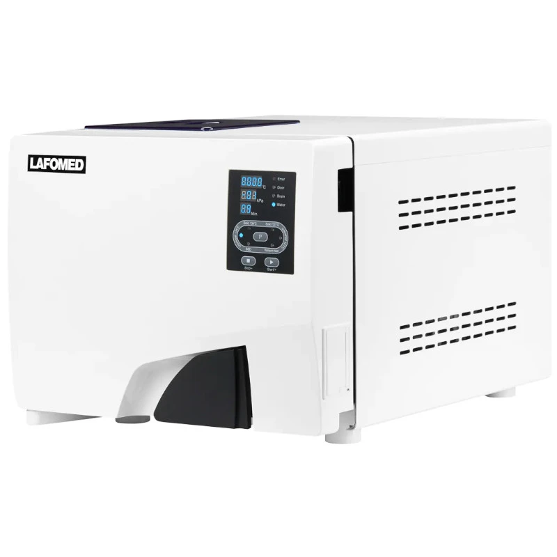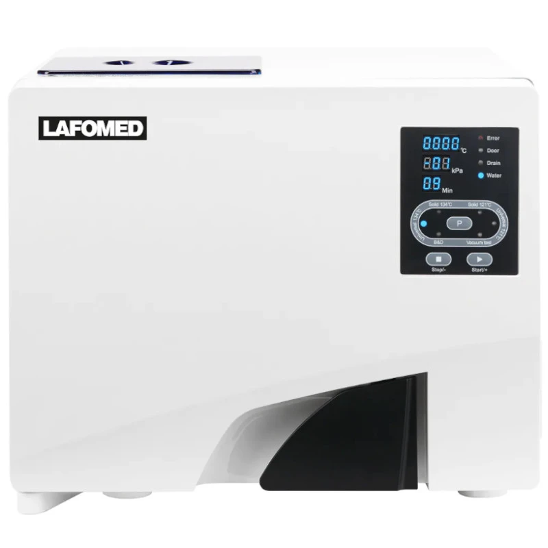 Biały autoklaw parowy klasy B o pojemności 8 litrów Lafomed Standard Line model LFSS08AA LED z wbudowaną drukarką stanowi wyrób medyczny. Przeznaczony do sterylizacji inwazyjnych wyrobów medycznych, instrumentów chirurgicznych, narzędzi stomatologicznych, strzykawek itp. Ma 6 automatycznych programów: 4 programy sterylizacji i 2 programy testowe oraz funkcję sterowania czasem sterylizacji.