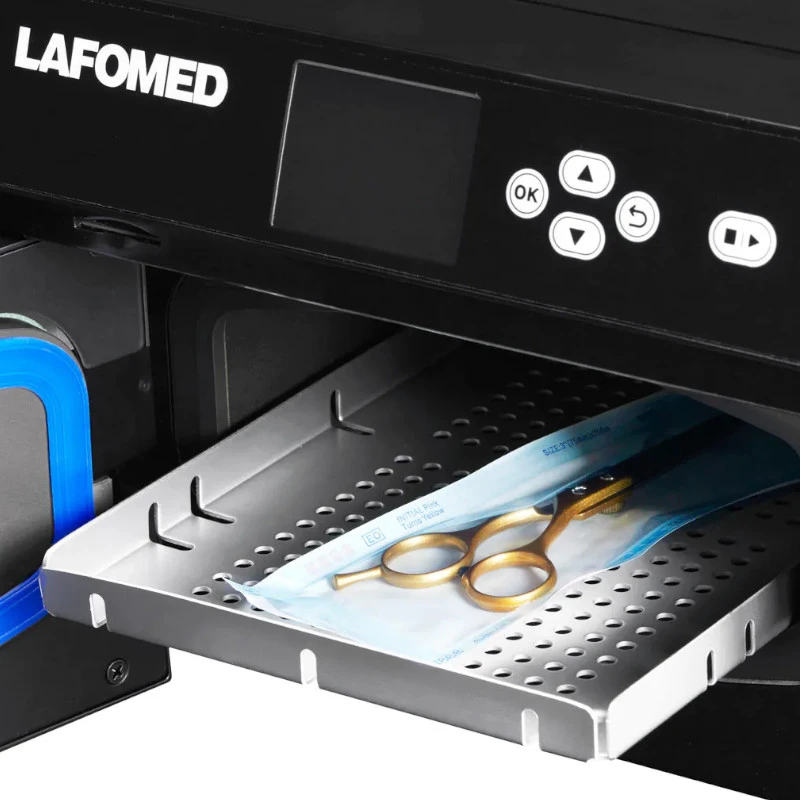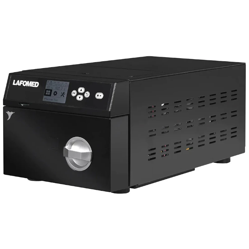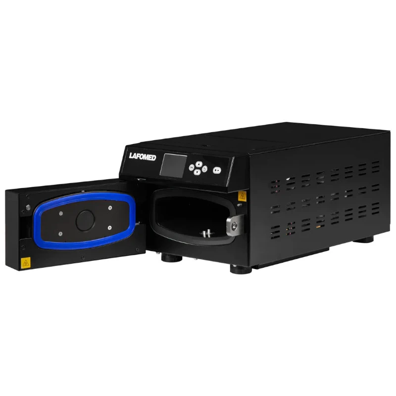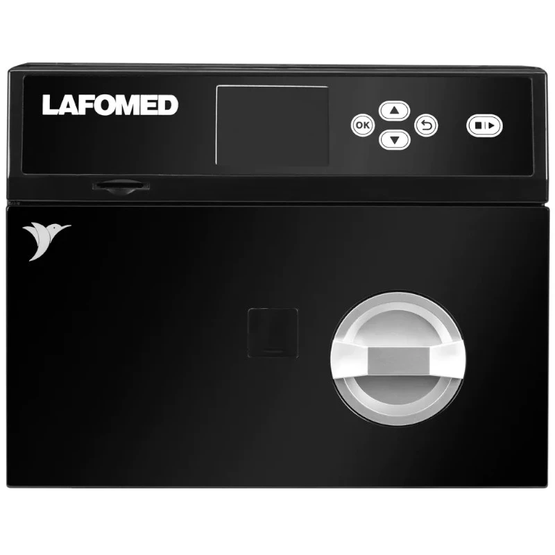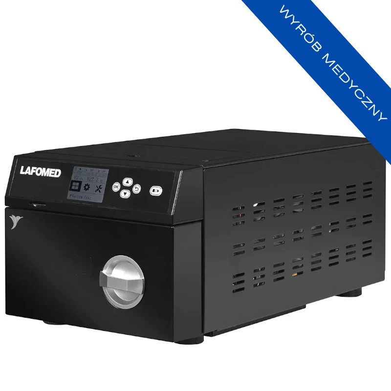 Czarny autoklaw parowy klasy B o pojemności 3 litrów Lafomed model LFSS03AA LCD stanowi wyrób medyczny. Przeznaczony do sterylizacji narzędzi medycznych odpornych na działanie wysokiej temperatury i wilgoci. Ma 7 automatycznych programów: 4 programy sterylizacji, 2 programy testowe, program suszenia. NIE ma wbudowanej drukarki. Status i parametry pracy wyświetlane są na wyświetlaczu LCD.