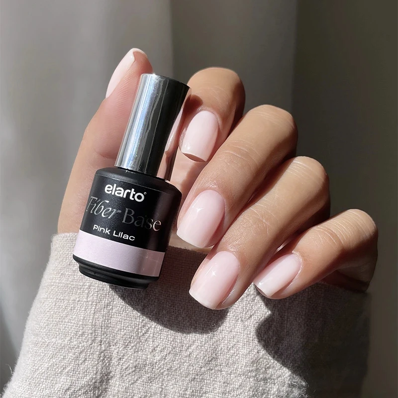- Nałóż cienką warstwę bazy elarto Fiber Base Pink Lilac, uważając, aby nie zalać skórek. Nie utwardzaj. Następnie aplikuj drugą, nieco grubszą warstwę, koncentrując produkt w centralnej części paznokcia, aby delikatnie go nadbudować. Utwardź w lampie UV/LED przez 60 sekund.