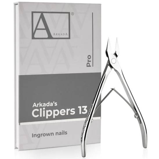 Cęgi Arkada's Clippers 13 o długości ostrza 13mm służą do podcinania i skracania paznokci wrastających. Boczne z prostym, szpiczastym ostrzem. Mają mechanizm dwusprężynowy. Są ręcznie ostrzone. Wykonane ze stali nierdzewnej. Dodatkowa odporność na korozję dzięki polerowaniu pastą GOI. Długość narzędzia: 12,5cm.