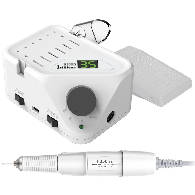 Frezarka Saeshin Brillian B350Digital/H350 z cyfrowym wyświetlaczem, rączką i obudową w białym kolorze. Bezwibracyjna i bardzo cicha podczas pracy, charakteryzuje się wysokim momentem obrotowym 3 Ncm. Pracuje w zakresie od 0 do 35 000 rpm, z możliwością zmiany kierunku obrotów. Lekka rączka z konstrukcją „twist lock” ułatwia wymianę frezów. Idealna dla stylistek i pedicurzystek. Moc: 50W.