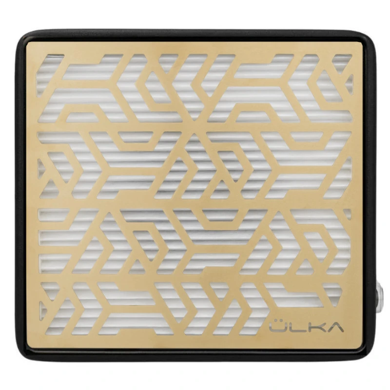 Profesjonalny pochłaniacz pyłu ÜLKA Premium o mocy 52W jest urządzeniem nablatowym, utrzymanym w czarno-złotej kolorystyce (pochłaniacz do postawienia na biurku). Cechuje go bardzo duża moc wchłaniania pyłu oraz cicha praca – generuje niski poziom hałasu do 55 dB. Strefa pochłaniania znajduje się na całej powierzchni nośnej urządzenia, dzięki czemu pochłaniacz doskonale radzi sobie z odsysaniem pyłu powstałego podczas zabiegów manicure i stylizacji paznokci oraz pedicure. Moc odsysania jest regulowana między 2 poziomami. Pochłaniacz ÜLKA Premium został wyposażony w filtr HEPA, który skutecznie usuwa aż 99,9% cząstek o wielkości do 0,3 mikrometra. Duża powierzchnia wchłaniania i wysoka wydajność urządzenia sprawiają, że wszelkie zanieczyszczenia i opiłki są wchłaniane prosto do filtra, bez rozsypywania ich na boki. Filtr wielokrotnego użytku, jest łatwy do czyszczenia – po skończonej pracy możesz go wygodnie odkurzyć lub po prostu wytrzepać. Istnieje również możliwość dokupienia zapasowych filtrów wymiennych. Pochłaniacz kasetowy ÜLKA Premium został wykonany z wysokiej jakości materiałów – korpus z odpornego na uderzenia tworzywa ABS, które jest łatwe w czyszczeniu i umożliwia spryskanie środkami dezynfekcyjnymi, kratka ze stali nierdzewnej. Antypoślizgowe, gumowe podkładki na nóżkach zapobiegają ślizganiu się urządzenia po powierzchni. Pochłaniacz pyłu ÜLKA Premium utrzymany w czarnej kolorystyce ze złotymi wykończeniami, sprawdzi się we wnętrzach o różnej stylistyce. Zestaw zawiera pochłaniacz, 1 filtr w urządzeniu, zasilacz sieciowy. W zależności od partii urządzenia kratka ochronna może mieć logo ÜLKA w rogu lub na środku.