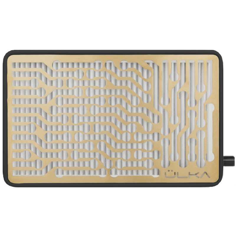 Pochłaniacz pyłu ÜLKA Nano w eleganckim czarnym kolorze ze złotymi kratkami i dwoma wentylatorami, o mocy 58W i mocy ssania 3,5 m/s, regulowanej na 2 poziomach, generuje niski poziom hałasu (do 85 dB). Ma dwa wbudowane porty do ładowania urządzeń mobilnych. Jest mocny i skuteczny. Strefa pochłaniania znajduje się na całej powierzchni nośnej urządzenia, dzięki czemu pochłaniacz doskonale radzi sobie z odsysaniem pyłu powstałego podczas zabiegów manicure i stylizacji paznokci oraz pedicure. Pochłaniacz ÜLKA Nano został wyposażony w filtr HEPA, który skutecznie usuwa aż 99,9% cząstek o wielkości do 0,3 mikrometra. Duża powierzchnia wchłaniania i wysoka wydajność urządzenia sprawiają, że wszelkie zanieczyszczenia i opiłki są wchłaniane prosto do filtra, bez rozsypywania ich na boki. Filtr wielokrotnego użytku, jest łatwy do czyszczenia – po skończonej pracy możesz go wygodnie odkurzyć lub po prostu wytrzepać. Istnieje również możliwość dokupienia zapasowych filtrów wymiennych. Pochłaniacz kasetowy ÜLKA Nano został wykonany z wysokiej jakości materiałów – korpus z odpornego na uderzenia tworzywa ABS, które jest łatwe w czyszczeniu i umożliwia spryskanie środkami dezynfekcyjnymi, kratka ze stali nierdzewnej. Antypoślizgowe, gumowe podkładki na nóżkach zapobiegają ślizganiu się urządzenia po powierzchni. Pochłaniacz pyłu ÜLKA Nano utrzymany w czarnej kolorystyce ze złotymi wykończeniami, sprawdzi się we wnętrzach o różnej stylistyce. Urządzenie nablatowe – pochłaniacz do postawienia na biurku. Zestaw zawiera pochłaniacz, 1 filtr w urządzeniu, 1 filtr zapasowy, szczoteczkę do usuwania pyłu, zasilacz sieciowy.