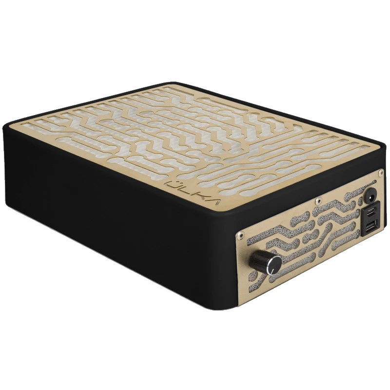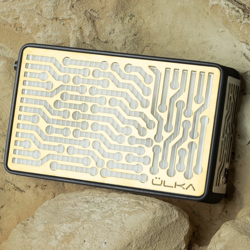 Czarny pochłaniacz pyłu Ülka Nano ze złotymi kratkami i dwoma wentylatorami, o mocy ssania 3,5 m/s regulowanej na 2 poziomach, z wbudowanymi portami do ładowania urządzeń mobilnych. Generuje niski poziom hałasu (85 dB). Mocny i skuteczny. Filtr HEPA usuwa 99,9% cząstek o wielkości do 0,3 µm. Pochłaniacz do postawienia na biurku, polecany do codziennej pracy. Moc: 58W.