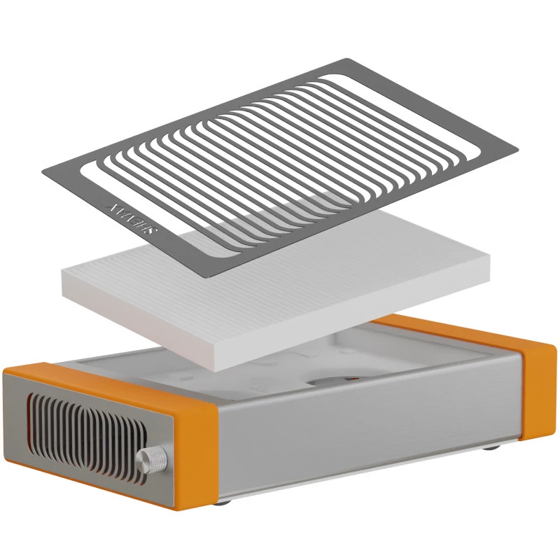Profesjonalny pochłaniacz pyłu SheMax Style Pro Neon Orange w srebrnym kolorze z neonowo-pomarańczowymi akcentami, stworzony dla stylistek i stylistów, którzy oczekują najwyższej jakości pracy i wyjątkowego komfortu podczas każdej stylizacji, a jednocześnie kochają wyraziste barwy i odważny styl. Zaprojektowane specjalnie dla SheMax podwójne silniki odśrodkowe, gwarantują efektywny przepływ powietrza z prędkością 3,7 m/s. Technologia "air bowl" kieruje pył bezpośrednio do środka, eliminując jego rozprzestrzenianie w powietrzu, a filtr wielokrotnego użytku zatrzymuje najdrobniejsze cząsteczki. Kompaktowa, lekka konstrukcja ułatwia ustawienie, przenoszenie i przechowywanie pochłaniacza, co docenią również stylistki pracujące mobilnie.