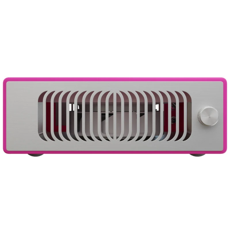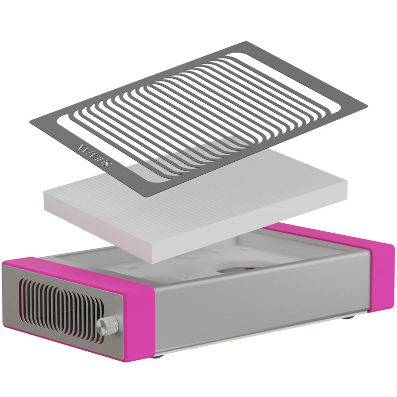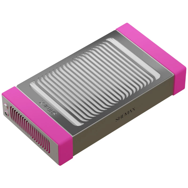 Mobilny pochłaniacz pyłu SheMax Style Pro Neon Pink ze srebrną obudową i neonowo-różowymi akcentami bocznymi, wyposażony w 2 silniki odśrodkowe z technologią "air bowl". Zapewnia skuteczne pochłanianie pyłu z prędkością 3,7 m/s, cichą pracę i wygodę użytkowania. Obszar roboczy wynosi 24x17cm, zasięg ssania 28x19cm. Kompaktowy, lekki, z filtrem wielokrotnego użytku i metalową kratką na magnesach.