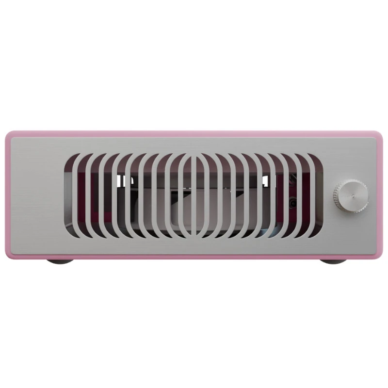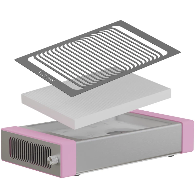 Mobilny pochłaniacz pyłu SheMax Style Pro Pastel Pink ze srebrną obudową i pastelowo-różowymi akcentami, wyposażony w 2 silniki odśrodkowe z technologią "air bowl". Zapewnia skuteczne pochłanianie pyłu z prędkością 3,7 m/s, cichą pracę i wygodę użytkowania. Obszar roboczy wynosi 24x17cm, zasięg ssania 28x19cm. Kompaktowy, lekki, z filtrem wielokrotnego użytku i metalową kratką na magnesach.