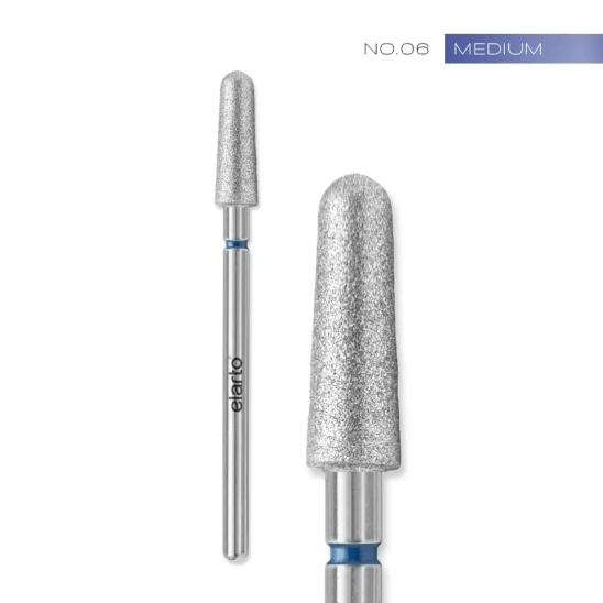 Frez elarto No6 to frez w kształcie zaokrąglonego stożka z nasypem diamentowym, o średnicy części roboczej 4mm i jej długości 12mm. Pozwala na dokładne i delikatne oczyszczenie płytki paznokcia, odsuwanie i odpychanie skórek oraz wstępne usunięcie nabłonków. Jego kształt ułatwia oczyszczanie wałów okołopaznokciowych. Frez charakteryzuje się gradacją o średniej ostrości.