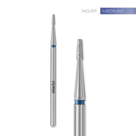 Frez elarto No7 to frez w kształcie mini zaokrąglonego stożka z nasypem diamentowym, o średnicy części roboczej 1,4mm i jej długości 4mm. Pozwala na dokładne i delikatne odsunięcie oraz opracowanie nawet najbardziej problematycznych i zgrubiałych skórek, bez obaw o uszkodzenie płytki. Frez charakteryzuje się gradacją o średniej ostrości.