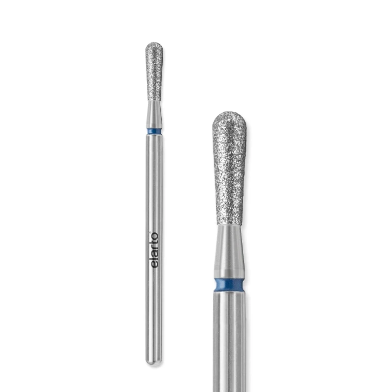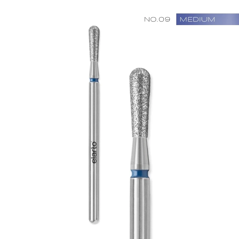 Frez elarto No9 to frez w kształcie maczugi / gruszki z nasypem diamentowym, o średnicy części roboczej 2,5mm i jej długości 8mm. Pozwala na wygładzenie i usunięcie zrogowaceń wałów paznokciowych. Dzięki swojemu kształtowi sprawdzi się podczas wygładzania wału okołopaznokciowego na mokro np. przy pomocy oliwki do skórek. Frez charakteryzuje się gradacją o średniej ostrości.