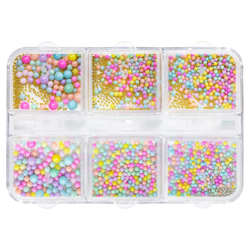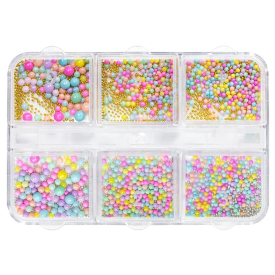 Ozdoby do paznokci Caviar & Round Bubble Beads w wiosenno-letnich kolorach pozwalają tworzyć wyjątkowe wzory. Zestaw zawiera błyszczące, drobne kuleczki w srebrnym i złotym kolorze, zwane kawiorem oraz wielobarwne kuleczki o różnych wielkościach w pastelowych odcieniach różu, fioletu, zieleni, żółci, pomarańczu i błękitu. Ozdoby zapakowane w praktyczny pojemnik z 6 przegrodami.