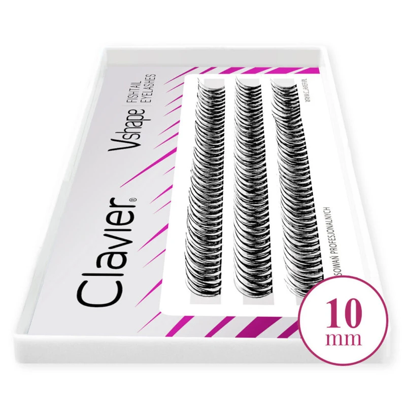 Czarne kępki rzęs Clavier Vshape Fishtail Eyelashes o długości 10 mm, mają charakterystyczny kształt litery V, skręt C i objętość 10D. Do ich produkcji wykorzystano ultra lekkie i elastyczne włókna syntetyczne klasy premium. Wyglądają więc niezwykle naturalnie i są jedwabiste w dotyku. Każda kępka została ręcznie i symetrycznie złożona, co gwarantuje maksymalną powtarzalność i precyzję w pracy. Kępki nie rozwarstwiają się podczas aplikacji, są odporne na deformacje i świetnie trzymają się kleju, co znacząco przyspiesza tempo zabiegu i podnosi komfort pracy. Są lekkie, nie obciążają oka, zachowują swój kształt przez cały okres noszenia.