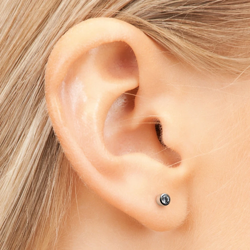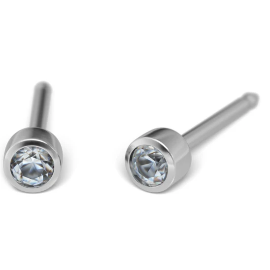 Kolczyk do przekłuwania uszu 7532-0204 Studex System 75 z okrągłą główką o średnicy 3mm – oczko imitujące brylant (szkło barwione) w pełnej oprawie zegarkowej. Wykonany z chirurgicznej stali nierdzewnej, ma srebrny kolor. Pakowany pojedynczo z zapinką, umieszczony w sterylnym wkładzie z nabojem umożliwiającym umieszczenie go w aparacie. Długość igły: 9,9mm.