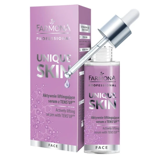 Aktywnie liftingujące serum z TENS'UP z profesjonalnej linii UNIQUE SKIN Farmona Professional to specjalistyczna kuracja liftingująca dla skóry dojrzałej, suchej, wymagającej ujędrnienia. Kompleks TENS'UP działa natychmiastowo, zapewniając efekt napięcia i wygładzenia, a niacynamid wspomaga poprawę elastyczności i redukcję zmarszczek. Ekstrakt z niebieskiej agawy rewitalizuje skórę, przywracając jej zdrowy blask, FUCOCERT i kwas hialuronowy głęboko nawilżają i zwiększają miękkość naskórka. Regularne stosowanie serum sprawia, że skóra staje się bardziej jędrna, gładka i odmłodzona. Preparat polecany do profesjonalnych zabiegów z użyciem ultradźwięków i mezoterapii bezigłowej.