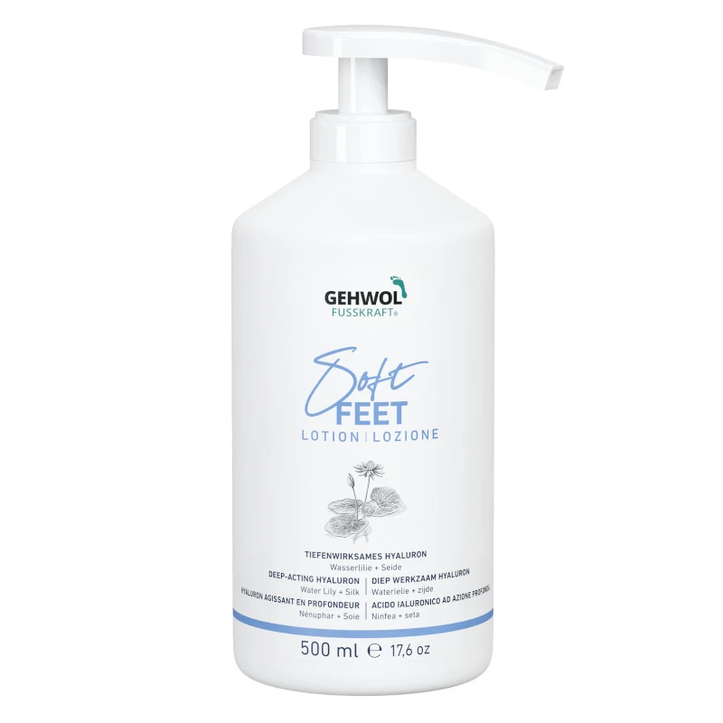 Lotion do stóp i nóg GEHWOL FUSSKRAFT® Soft Feet Lotion intensywnie nawilża, odświeża i regeneruje suchą i szorstką skórę. Ekstrakt z lilii wodnej działa kojąco na skórę, ekstrakt z jedwabiu ją wygładza, a ekstrakt z alg ma dobroczynne działanie na zmęczone i ciężkie nogi. Intensywnie działający kwas hialuronowy wnika w głębokie warstwy skóry, wspomagając jej regenerację i wzmacniając naturalne mechanizmy obronne. Olejek z awokado zapobiega wysuszaniu i łuszczeniu skóry, likwidując szorstkość naskórka i zapobiegają utracie wody. Witamina E (w stabilnej formie octanu) chroni komórki przed stresem oksydacyjnym i wspiera regenerację skóry. Lekka konsystencja z cennymi lipidami, takimi jak roślinny skwalan, zapewnia jedwabiście miękką skórę oraz pięknie zadbane stopy i nogi. Krem dostępny w dużym, ekonomicznym opakowaniu z wygodną i higieniczną w użyciu pompką. Łatwo rozprowadza się na skórze i szybko się wchłania. Świeży zapach rewitalizuje ciało, umysł i duszę.