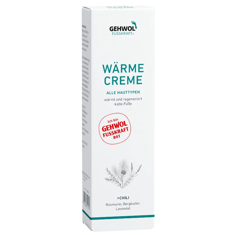 Krem GEHWOL FUSSKRAFT® Wärme Creme o działaniu rozgrzewającym polecany jest dla osób, które zmagają się z problemem marznących stóp – zapewnia przyjemne ciepło i intensywną pielęgnację suchej, szorstkiej skórze. Naturalne ekstrakty z papryki chili i imbiru oraz kamfora pobudzają mikrokrążenie, zapewniając przyjemne uczucie ciepła. Naturalne olejki eteryczne z rozmarynu, sosny górskiej i lawendy działają pielęgnacyjnie i aromaterapeutycznie, a także nadają kremowi charakterystyczny, odświeżający zapach. Składniki antyseptyczne chronią przed grzybicą stóp i swędzeniem, również między palcami. Mocznik nawilża i zmiękcza, a lanolina zatrzymuje wilgoć oraz odbudowuje barierę ochronną skóry. Lipidy dbają o jej elastyczność i gładkość. Bogata, kremowa formuła i starannie dobrane składniki aktywne intensywnie pielęgnują suchą i spierzchniętą skórę stóp, intensywnie ją odżywiają i wygładzają.