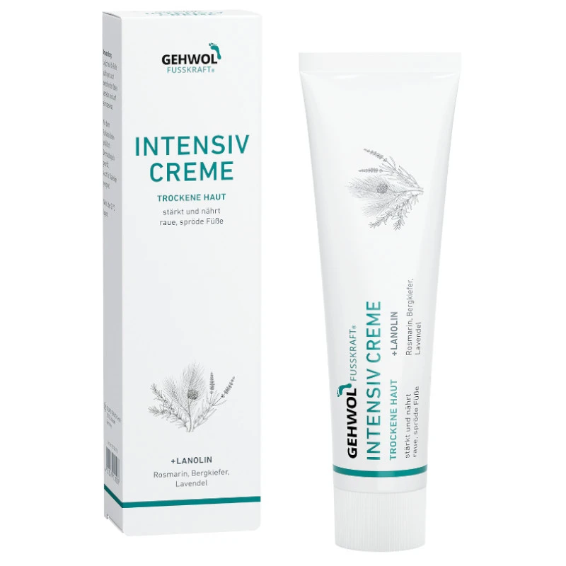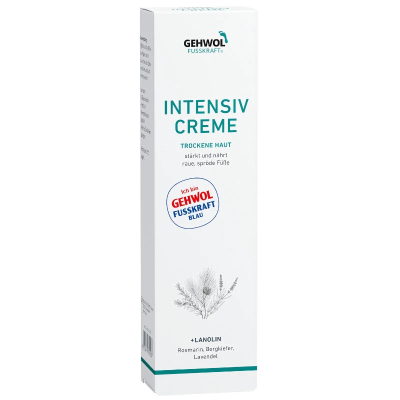 Krem GEHWOL FUSSKRAFT® Intensiv Creme o bogatej, nawilżającej formule wzmacnia i odżywia suchą, szorstką i spierzchniętą skórę stóp. Zawiera naturalną lanolinę, aktywne składniki dezynfekujące, naturalne olejki eteryczne z rozmarynu, sosny górskiej, lawendy, kamfory i mentolu, aloes oraz mocznik. To połączenie składników sprawia, że krem doskonale nawilża i odświeża skórę, łagodząc uczucie palących i bolących stóp. Zapobiega również grzybicy stóp i świądowi skóry. Kosmetyk dobrze się wchłania. Charakterystyczny zapach zawdzięcza mieszance olejków eterycznych. Regularnie stosowany powoduje, że skóra staje się gładka, miękka i elastyczna. Polecany dla diabetyków.