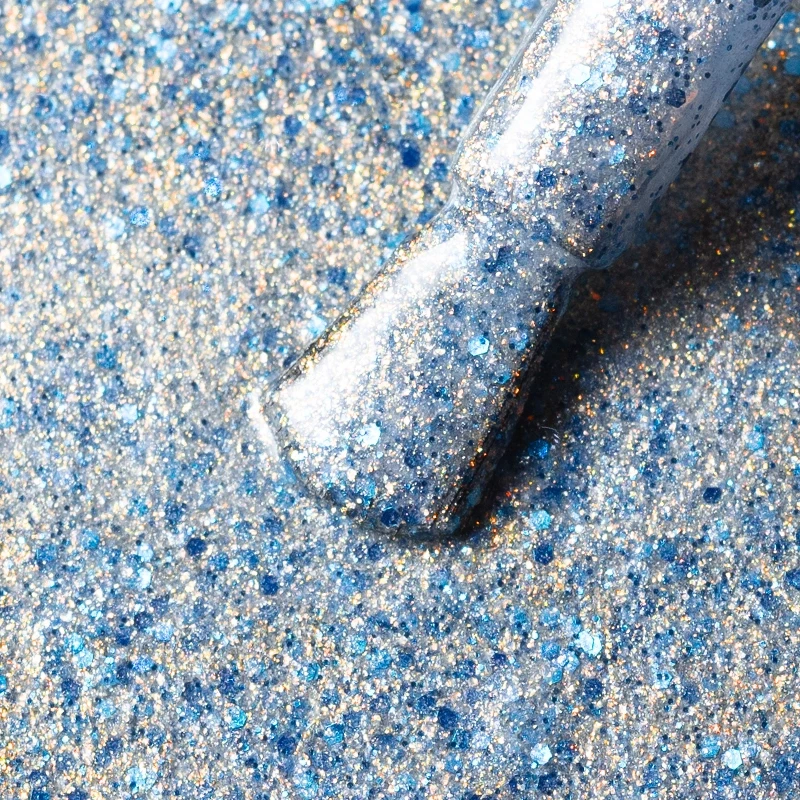 Lakier hybrydowy Lacogel nr 892 Mróz i Luz przemieni Twoje paznokcie w zimowe arcydzieło. Jego szampański odcień, po brzegi wypełniony niebieskimi drobinkami, nie jest przypadkowy – stanowi idealne zwieńczenie kolekcji "Frost & Furious". Kolor jest jednak na tyle uniwersalny, że pasuje do każdej stylizacji paznokci, niezależnie od pory roku.