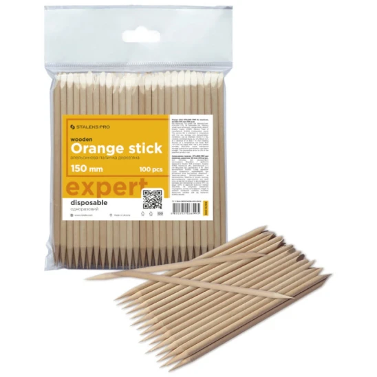 Jednorazowe, drewniane patyczki Staleks Pro o dwóch różnych zakończeniach, długości 15cm i średnicy 4mm, wykonane z drewna pomarańczowego. Mają optymalny rozmiar i kształt. Są trwałe i nie rozwarstwiają się podczas pracy. Przeznaczone do indywidualnego zastosowania. Ich użycie zwiększa poziom bezpieczeństwa i ułatwia przestrzegania zasad higieny podczas manicure, pedicure i stylizacji paznokci.