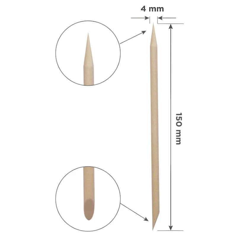 Jednorazowe patyczki wykonane z drzewa brzozowego. Zakończone na dwa różne sposoby. Szpic idealnie sprawdzi się podczas wszelkiego rodzaju zdobień, nakładania ozdób, mieszania żeli i lakierów na płytce. Druga - skośna końcówka zastąpi metalowe radełko przy zabiegach manicure i pedicure.