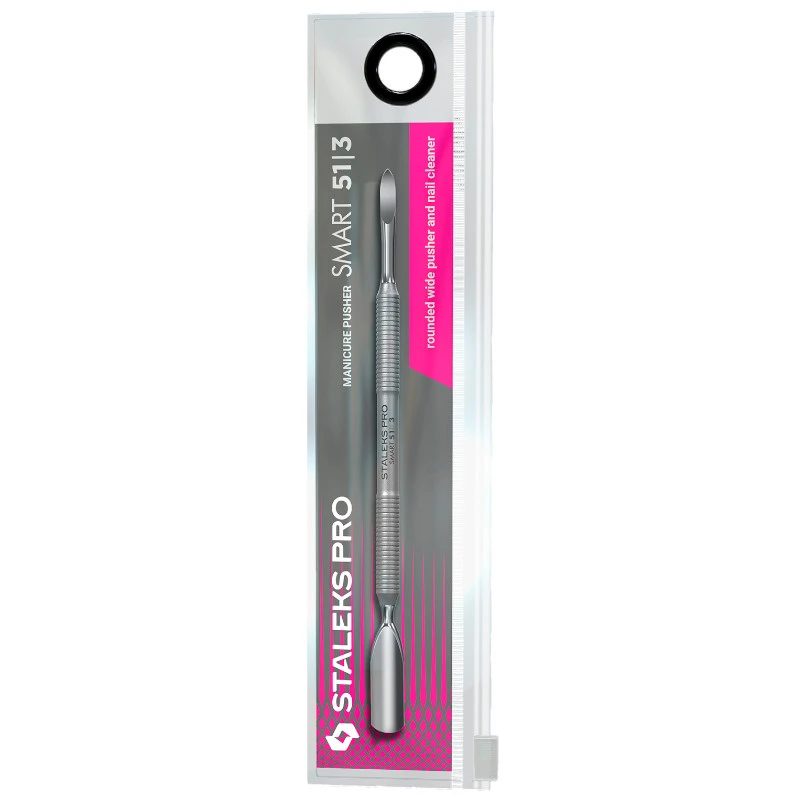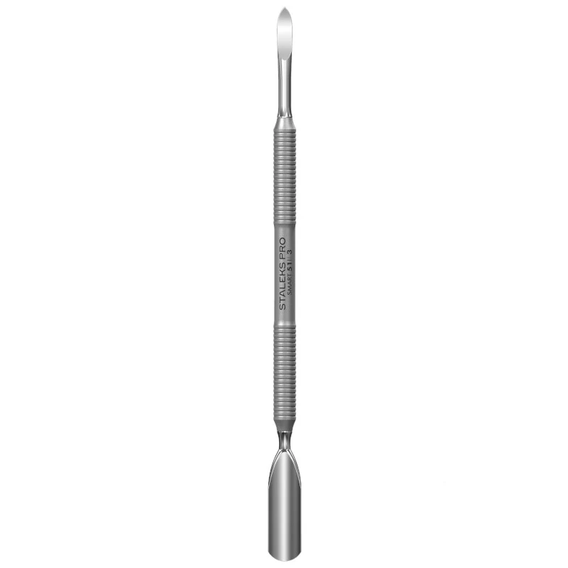 Dwustronne narzędzie do skórek Staleks Pro Smart 51 typ 3 ze stali nierdzewnej. Zaokrąglone kopytko naturalnie dopasowuje się do kształtu paznokcia, umożliwiając dokładne i bezpieczne uniesienie oraz odsunięcie skórek. Wąska, lekko zaostrzona końcówka o wygiętym kształcie służy do usuwania suchego naskórka z płytki paznokcia, oczyszczania wałów bocznych i usuwania zabrudzeń spod wolnego brzegu.
