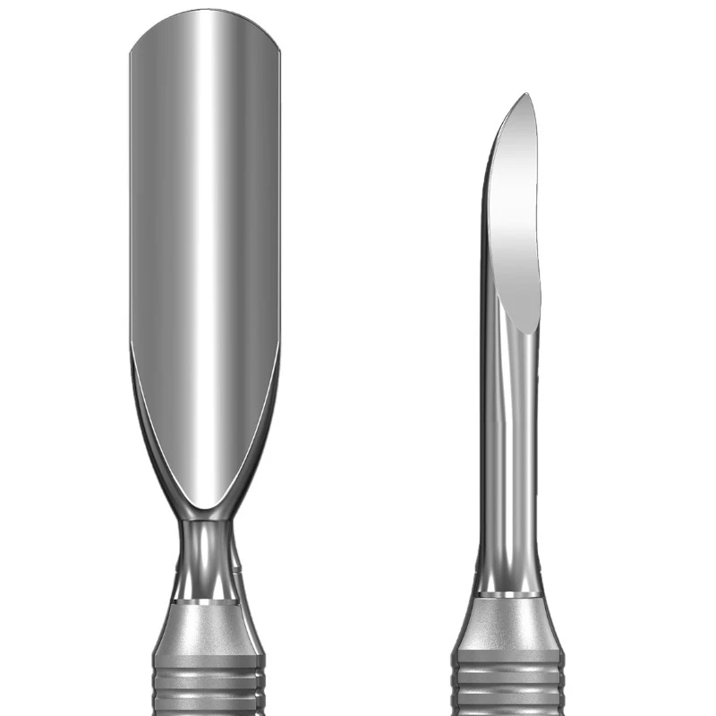 Dwustronne narzędzie PC8843 stosowane do odpychania skórek podczas zabiegu manicure, manicure hybrydowego, pedicure oraz przygotowywania paznokci do przedłużenia / korekty dowolną techniką. Zaokrąglona końcówka, tzw. kopytko, delikatnie odpycha skórki i usuwa zalegający na płytce naskórek. Radełko wykonane z wysokiej jakości, nierdzewnej stali chirurgicznej.