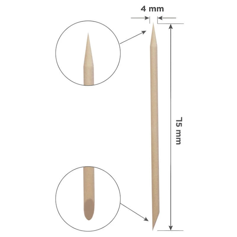 Jednorazowe patyczki wykonane z drzewa brzozowego. Zakończone na dwa różne sposoby. Szpic idealnie sprawdzi się podczas wszelkiego rodzaju zdobień, nakładania ozdób, mieszania żeli i lakierów na płytce. Druga - skośna końcówka zastąpi metalowe radełko przy zabiegach manicure i pedicure.