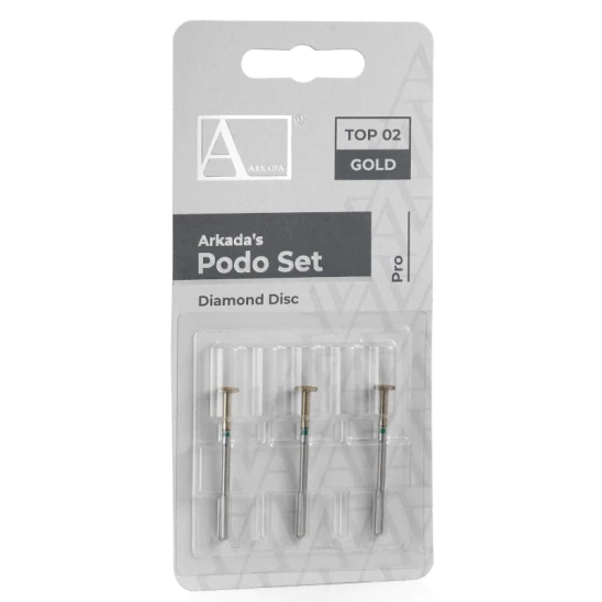 Arkada’s Podo Set Top 02 Gold, przygotowany przez markę Aarkada, to zestaw trzech identycznych frezów podologicznych Diamond Disc w kształcie tarczki o średnicy 6 mm, pokrytych złotą, cyrkonową nanopowłoką ZRN. Innowacyjna, cienka wersja części pracującej przeznaczona jest do skracania paznokci dystroficznych i wstępnego opracowania rekonstrukcji płytki. Frez wykonany ze stali nierdzewnej z nasypem diamentowym i nanopowłoką ZRN, oznaczony zielonym paskiem. Ilość sztuk w blistrze: 3.