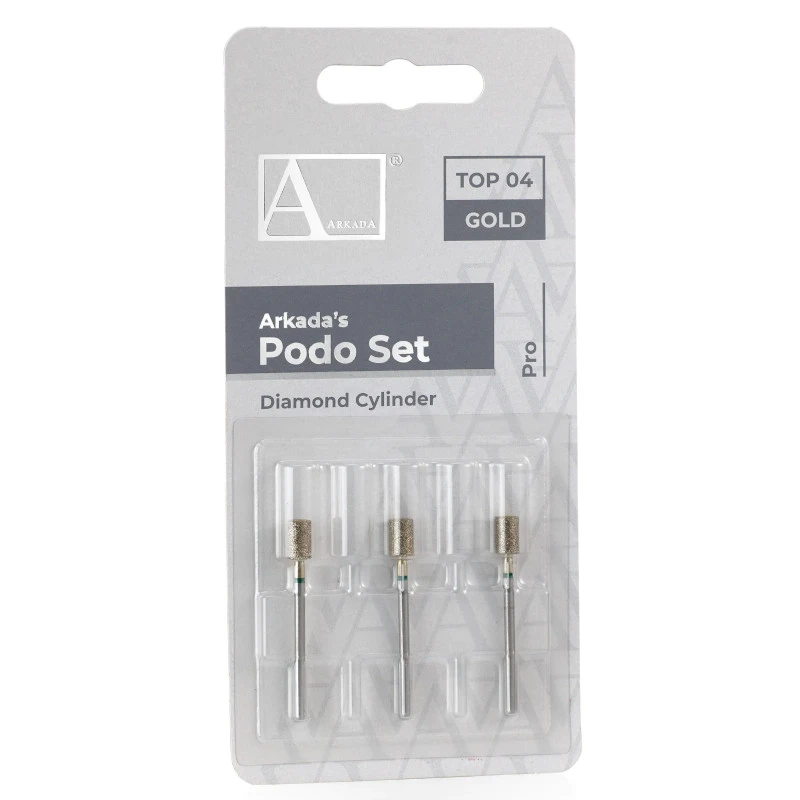 Arkada’s Podo Set Top 04 Gold to zestaw 3 frezów w kształcie walca o średnicy 5mm, wykonanych ze stali nierdzewnej z nasypem diamentowym i złotą cyrkonową nanopowłoką ZRN, która zabezpiecza nasyp i ostrza, wydłuża żywotność narzędzi i minimalizuje przegrzewanie podczas pracy. Frez służy do szybkiego opracowania całej powierzchni płytki paznokciowej, sprawdza się także przy skracaniu rekonstrukcji.
