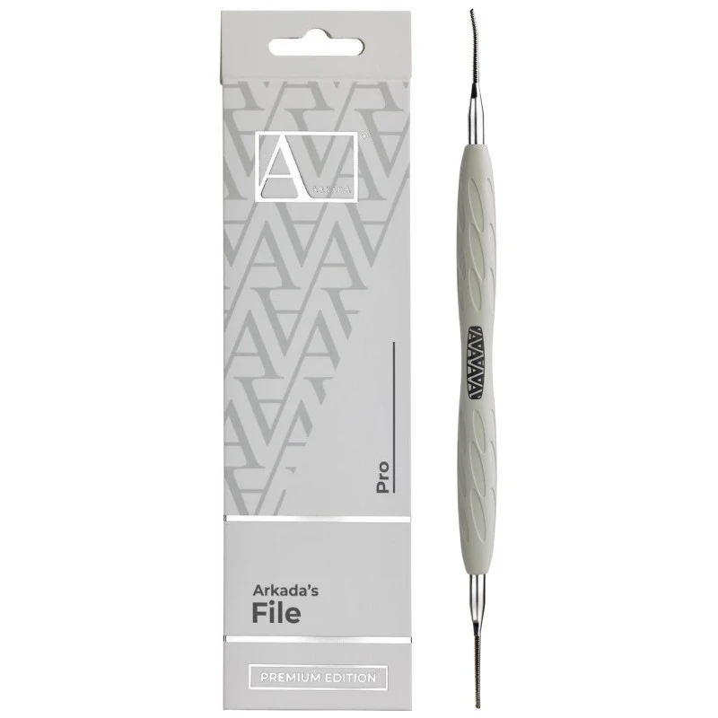 Pilnik kątowy Arkada’s File to precyzyjne narzędzie do wyrównywania brzegów płytki paznokcia lub rekonstrukcji. Wyposażony w dwie różne końcówki – do zaokrąglania rogów płytki oraz do wygładzania jej krawędzi. Ma rękojeść pokrytą hipoalergicznym silikonem, co gwarantuje pewny chwyt podczas użytkowania. Pilnik można bezpiecznie dezynfekować i sterylizować. Długość całkowita narzędzia: 16,5cm.