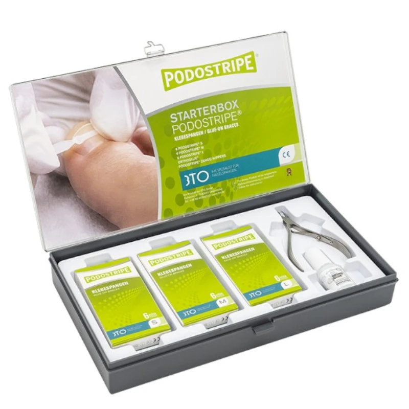 Zestaw klamer 3TO Podostripe Starerbox do wrastających i zdeformowanych paznokci stanowi wyrób medyczny. Klamra Podostripe to jednoczęściowa orteza ortonyksyjna wykonana z tworzywa sztucznego. W zestawie: 6 klamer S + 6 chustek dezynfekujących, 6 klamer M + 6 chustek dezynfekujących, 6 klamer L + 6 chustek dezynfekujących, klej Orthoglue 7ml, kleszcze Podostripe.