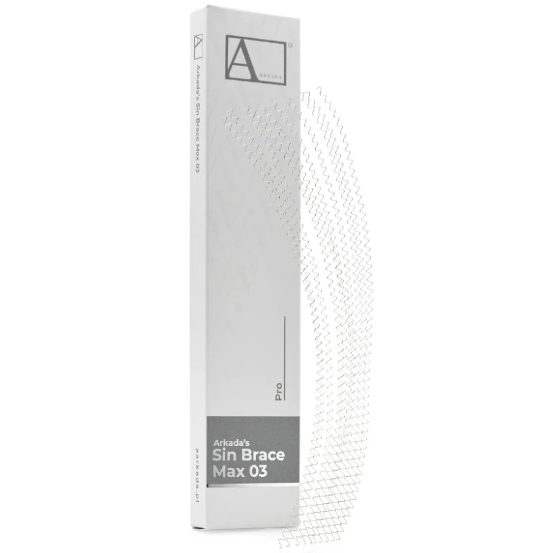Drut korekcyjny w kształcie dużej fali sinusoidalnej Arkada's SinBrace Max 03 o średnicy 0,3 mm. Przeznaczony jest do tworzenia klamer indywidualnych, aplikowanych na paznokciach wymagających dużej korekty kształtu. Klamrę wyróżnia większa amortyzacja, dzięki czemu sprawdza się u osób aktywnych fizycznie. Drut Arkada's SinBrace Max 03 wykonany jest ze stopu stali nierdzewnej 316L, stosowanej we wszystkich klamrach marki AArkada.