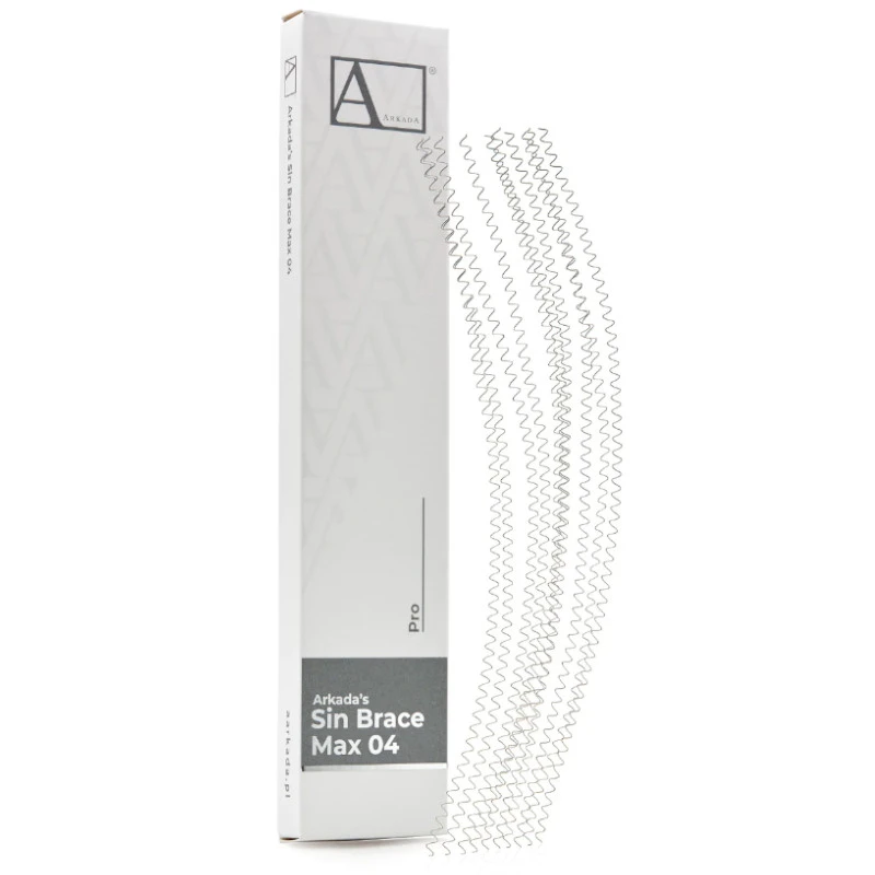 Drut korekcyjny w kształcie dużej fali sinusoidalnej Arkada's SinBrace Max 04 o średnicy 0,4 mm. Przeznaczony jest do tworzenia klamer indywidualnych, aplikowanych na paznokciach wymagających dużej korekty kształtu. Klamrę wyróżnia większa amortyzacja, dzięki czemu sprawdza się u osób aktywnych fizycznie. Drut Arkada's SinBrace Max 04 wykonany jest ze stopu stali nierdzewnej 316L, stosowanej we wszystkich klamrach marki AArkada.