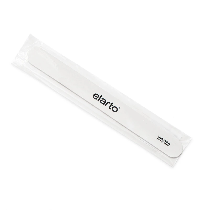 Biały pilnik w folii ochronnej (bezpieczny pakiet) o prostym kształcie i ziarnistości 100/180 grit, z czarnym logo elarto i drewnianym środkiem – wersja SLIM o grubości 1mm. Polecany do skracania i nadawania kształtu paznokciom naturalnym u stóp, do prac związanych z różnymi technikami przedłużania paznokci. Wysokiej klasy ścierniwo zapobiega zapychaniu powierzchni pilnika podczas pracy.