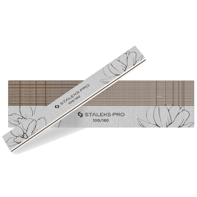 Jednorazowy pilnik mineralny do paznokci Staleks Pro Expert 20 o gradacji 100/180 o prostym kształcie, został zaprojektowany z myślą o precyzyjnym opracowaniu zarówno naturalnych, jak i sztucznych paznokci. Umożliwia skuteczne nadanie kształtu, skrócenie oraz końcowe opracowanie płytki. Pozwala na dokładne korygowanie kształtu naturalnych i sztucznych paznokci bez niszczenia płytki i bez tworzenia w niej mikropęknięć. Wysokiej jakości materiał ścierny zachowuje swoje właściwości przez długi czas. Specjalna powłoka zapobiega zapychaniu się ścierniwa pyłem organicznym podczas pracy. Warstwa pianki otula drewnianą bazę pilnika oraz zmniejsza nacisk na płytkę paznokcia. Dwie powierzchnie robocze o różnych gradacjach, charakterystyczny kształt oraz wysokiej jakości materiały zapewniają komfort pracy i długotrwałą ostrość.