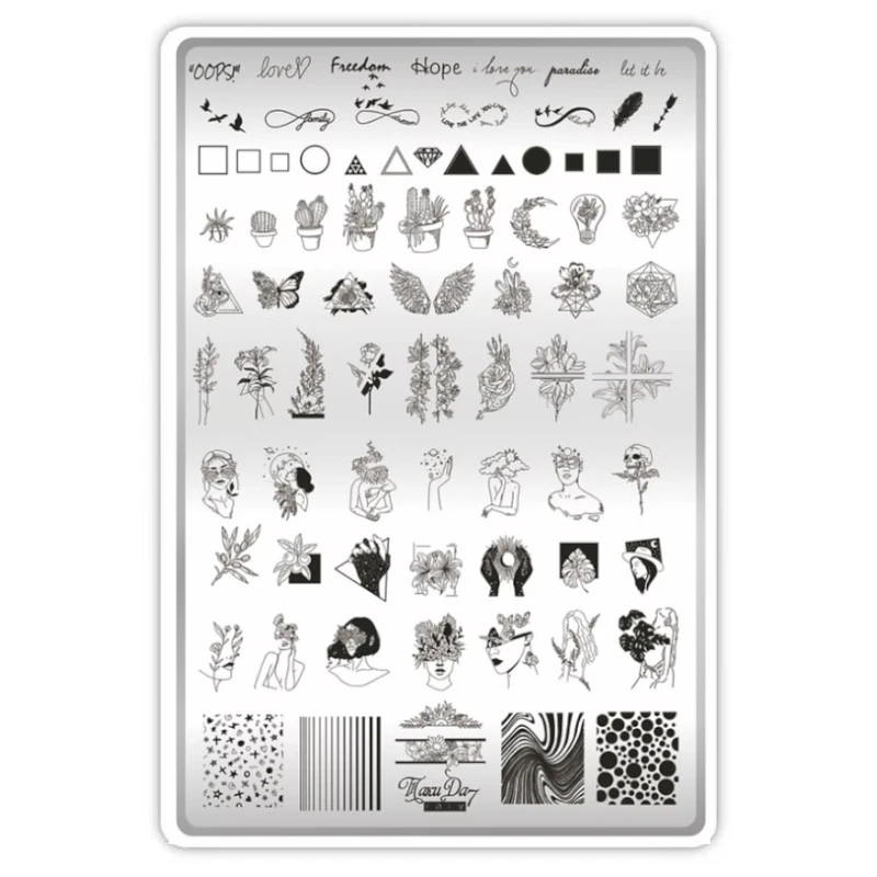 Płytka do zdobień paznokci metoda stampinguTaki Da Tattoo 07 to niezastąpione narzędzie dla miłośniczek wyjątkowych, artystycznych stylizacji inspirowanych tatuażem. Na płytce znajdziesz szeroki wybór oryginalnych wzorów – minimalistyczne grafiki przedstawiające twarze kobiet, abstrakcyjne linie i kształty geometryczne, roślinne motywy, modne minimalistyczne napisy ("freedom", "hope", "love") oraz różnorodne ozdobne akcenty, takie jak liście, pióra, kwiaty, kaktusy czy dekoracyjne paski. Każdy motyw został precyzyjnie wygrawerowany, co pozwala na dokładne i szybkie odbicie wzorów na paznokciach. Każdy motyw został starannie wygrawerowany, co pozwala na precyzyjne i szybkie przenoszenie wzorów na paznokcie. Blaszka jest doskonała zarówno dla początkujących, jak i profesjonalistek, które cenią szybkie i efektowne zdobienia. Różnorodność wzorów pozwala na stworzenie zarówno minimalistycznych, jak i bardziej ozdobnych kompozycji.