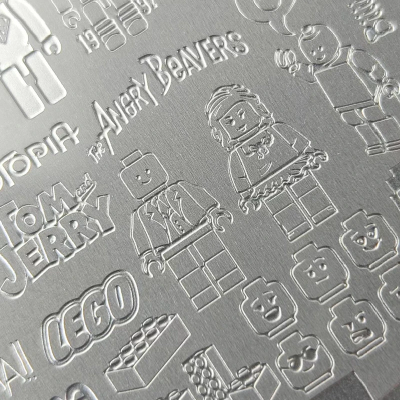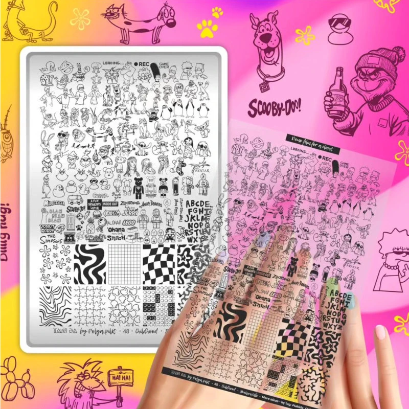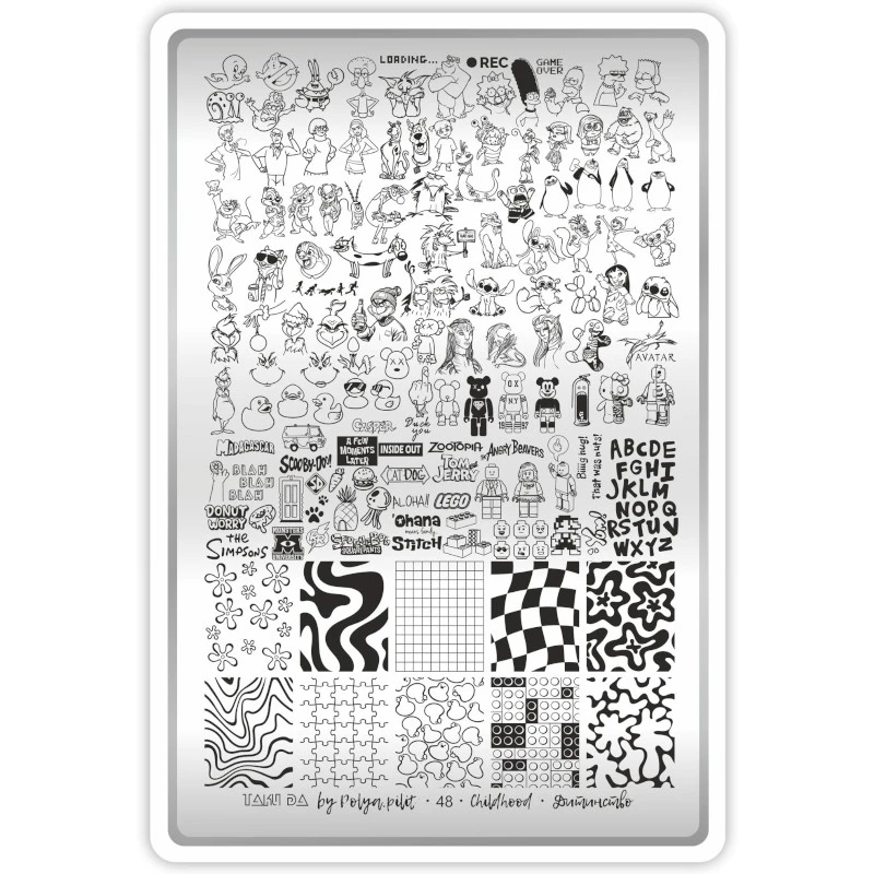 Płytka do stempli Taki Da Childhood 48 to prawdziwa podróż do świata bajek i animacji. Znajdziesz tu bohaterów Disneya, Tom & Jerry, Simpsonów, Scooby-Doo, SpongeBoba, a także Caspera, Potwory i Spółkę czy motywy LEGO. Idealna do stylizacji pełnych radości, koloru i nostalgii. Blaszka Premium z matowego metalu z głębszym grawerem zapewnia perfekcyjny transfer wzorów.
