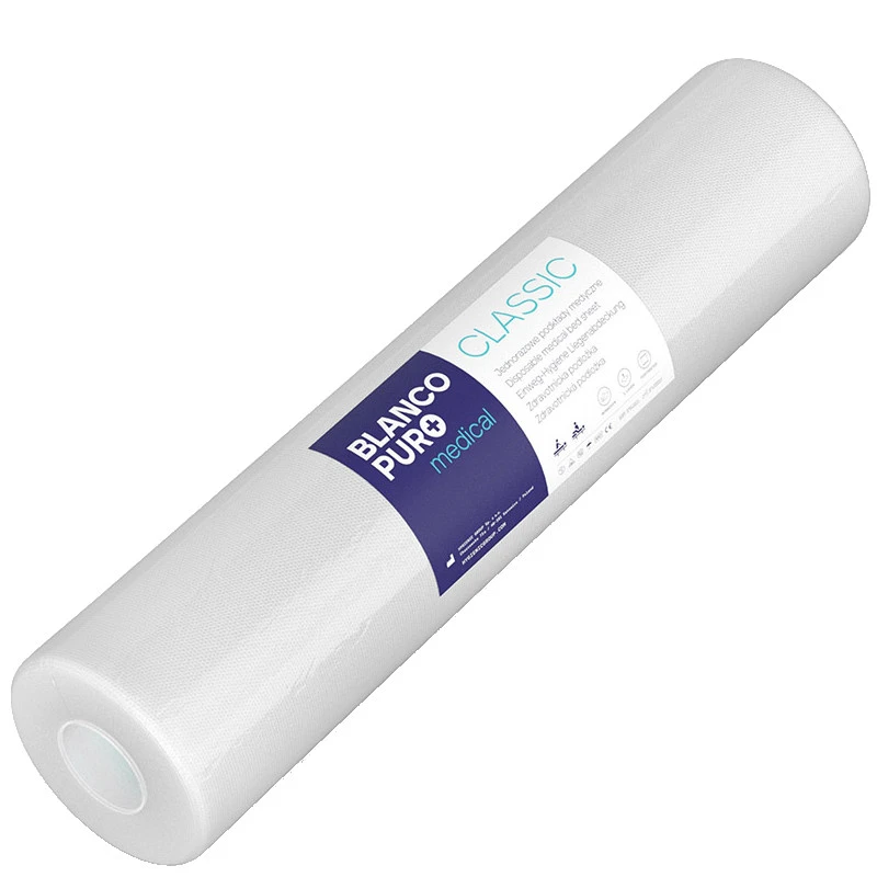 Biały, jednorazowy podkład medyczny BLANCO PURO medical CLASSIC stanowi wyrób medyczny. Ma na celu izolację pacjenta od potencjalnych zakażeń około zabiegowych na powierzchni kozetek lekarskich, stołów masażu leczniczego i fizjoterapeutycznych w przychodniach lekarskich, gabinetach fizjoterapeutycznych i kosmetycznych. Rozmiar 60cm x 50m, perforacja co 39cm. Surowiec: włóknina fizelina 14g/m2.