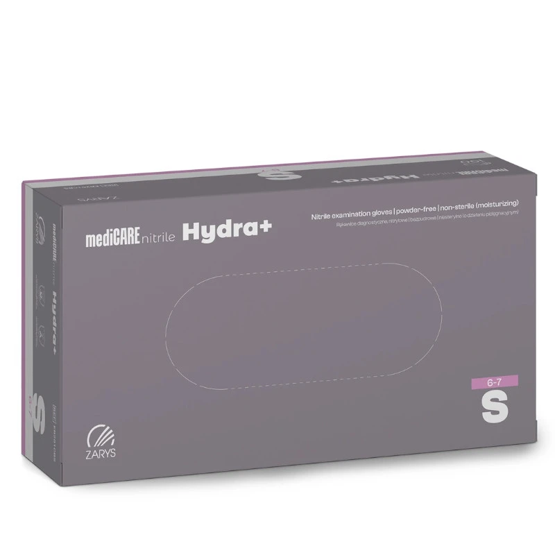 Rękawice diagnostyczne, nitrylowe, bezpudrowe, niesterylne (o działaniu pielęgnacyjnym) Zarys mediCARE nitrile Hydra+ Nitrile examination gloves, powder-free, non-sterile (moisturizing) stanowią wyrób medyczny. Rozmiar S. Mają niebieski kolor. Teksturowane na końcach palców. Stanowią barierę dla transmisji mikroorganizmów pomiędzy operatorem a pacjentem. Minimalizują ryzyko zakażeń krzyżowych.