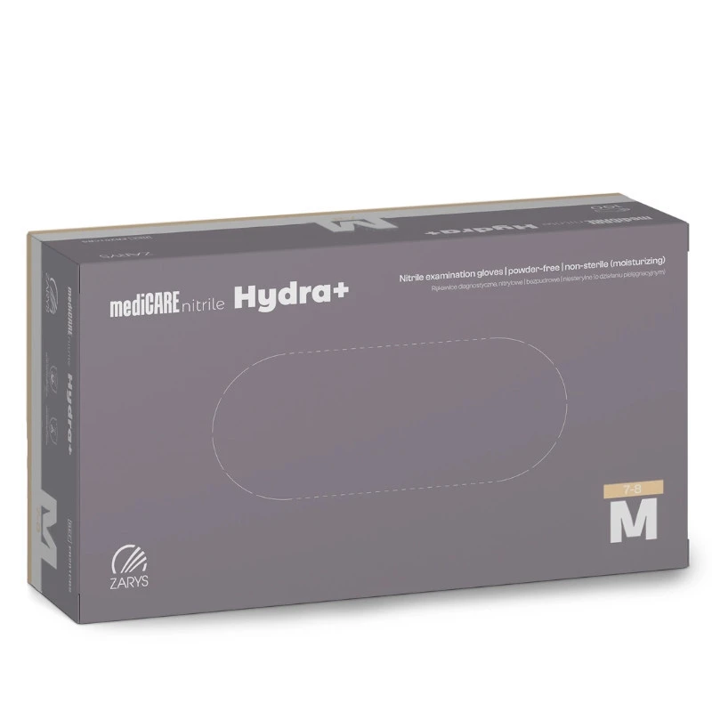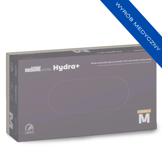 Rękawice diagnostyczne, nitrylowe, bezpudrowe, niesterylne (o działaniu pielęgnacyjnym) Zarys mediCARE nitrile Hydra+ Nitrile examination gloves, powder-free, non-sterile (moisturizing) stanowią wyrób medyczny. Rozmiar M. Mają niebieski kolor. Teksturowane na końcach palców. Stanowią barierę dla transmisji mikroorganizmów pomiędzy operatorem a pacjentem. Minimalizują ryzyko zakażeń krzyżowych.