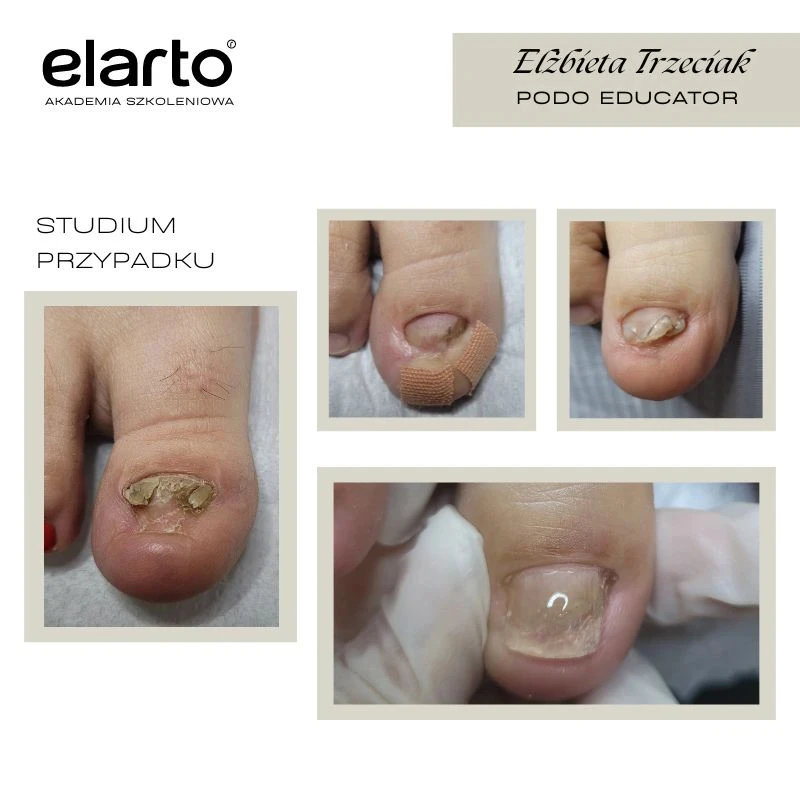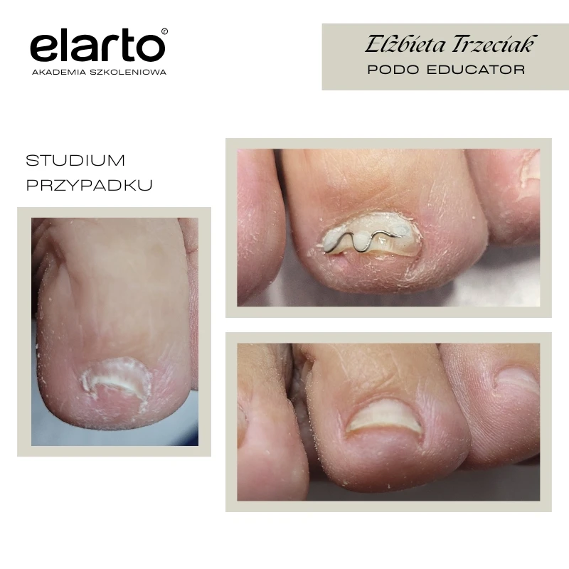 - Przygotowanie teoretyczne - wprowadzenie do pracy z drutami o grubości 0,2 mm, 0,3 mm i 0,4 mm oraz z klamrą Mini M, obejmujące omówienie różnic w ich zastosowaniu, zasad prawidłowego doboru oraz sposobu działania w różnych przypadkach wrastania lub wkręcania się paznokcia.