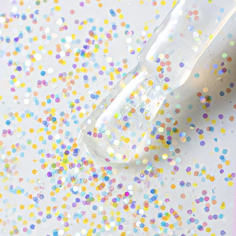 - Zatopione w topie wielobarwne drobinki, dodają mu blasku gwarantując błyszczące wykończenie każdej stylizacji.