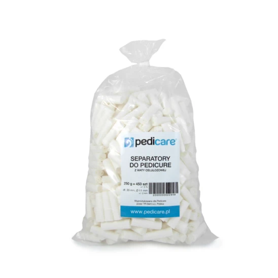 Jednorazowe wałeczki bezuciskowe - separatory do palców u stóp. Wykonane w 100% z waty celulozowej. Niezwykle wygodne w użyciu. Stosowane do odseparowywania od siebie palców u stóp podczas zabiegów pielęgnacyjnych, pedicure, pedicure leczniczego oraz specjalistycznych zabiegów podologicznych.