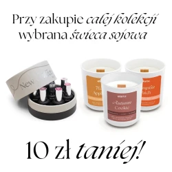Świeca sojowa Autumn Cookie pachnie ciepłym, jesiennym piernikiem z nutą cynamonu, imbiru, goździków i słodkiego miodu. Kompozycja jest głęboka, korzenna i otulająca. Harmonijnie połączone aromaty tworzą przytulny, relaksujący zapach, który wypełnia dom jesienną atmosferą. Świeca wykonana z naturalnego wosku sojowego. Ma drewniany knot, który przyjemnie...
