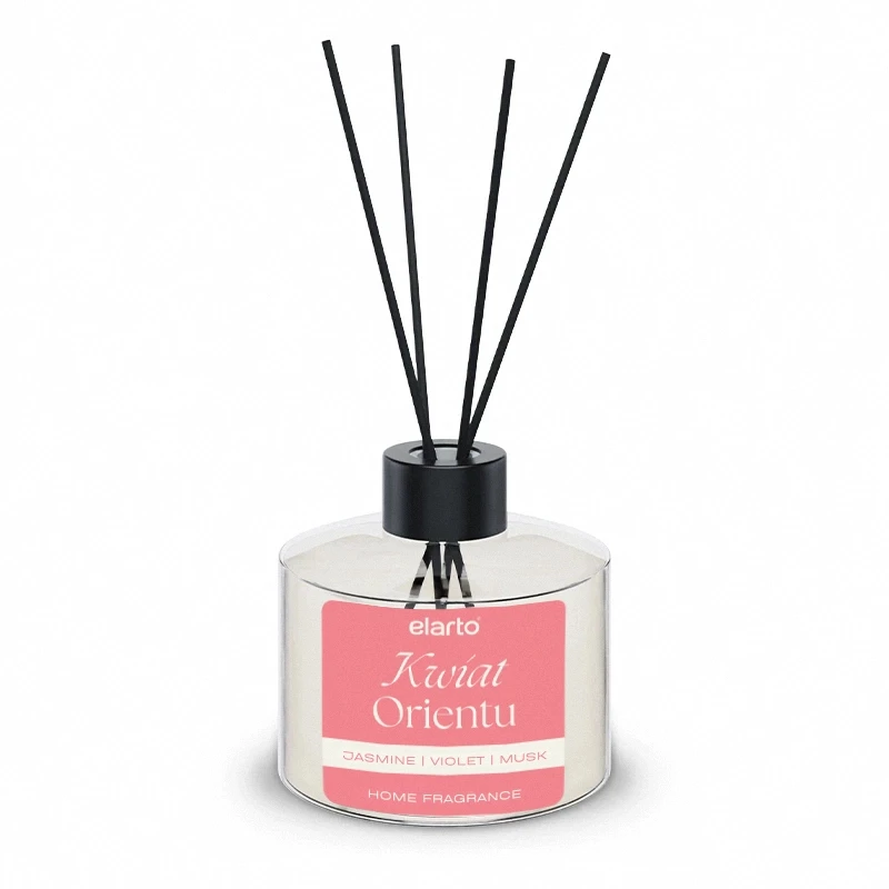 Kompozycja zapachowa elarto Kwiat Orientu została zamknięta w eleganckim, szklanym flakonie w kształcie kałamarza. Za pośrednictwem zanurzonych w niej, rattanowych patyczków absorbujących płyn, powoli odparowuje, wypełniając pomieszczenie przytulnym i kwiatowym aromatem. Patyczki rattanowe, ich właściwości oraz specjalna konstrukcja, przenoszą zapach w górę, stopniowo go uwalniając, bez utraty jego intensywności. Dyfuzor zapakowany w czarny, elegancki kartonik.
