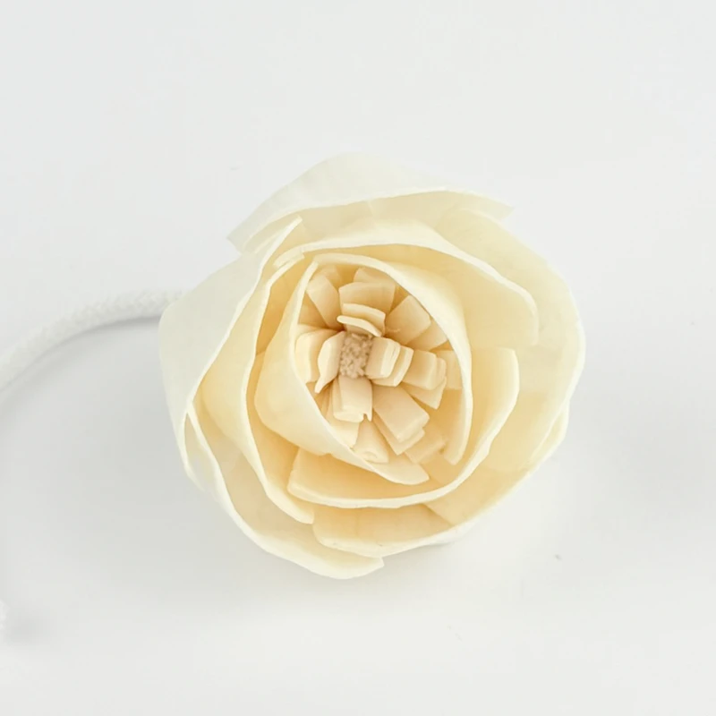 Dekoracyjny kwiat o miękkich, warstwowych płatkach, przypominający pełną różę ogrodową. Ręcznie wykonany z materiału pozyskanego z manioku – naturalnej, biodegradowalnej skrobi roślinnej. Zawieszony na miękkim, bawełnianym sznurku, który działa jak knot, stopniowo wchłaniając kompozycję zapachową z dyfuzora i przekazując ją do kwiatu. Dzięki lekkiej, porowatej strukturze materiału, kwiat doskonale oddaje zapach do otoczenia, rozpraszając go równomiernie i tworząc przyjemną, relaksującą atmosferę. Jest delikatny w dotyku, a jednocześnie trwały i odporny na odkształcenia.
