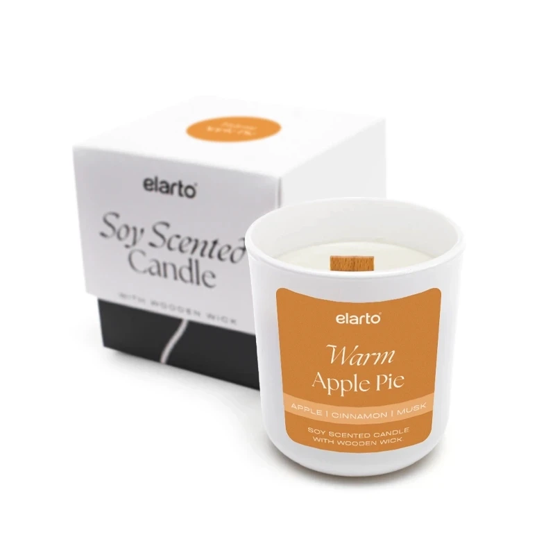 Świeczka zapachowa elarto Warm Apple Pie została wykonana ręcznie w 100% z niemodyfikowanego wosku sojowego (non GMO), wolnego od pestycydów, herbicydów i toksyn, uzyskiwanego z nasion soi. Wosk sojowy jest produktem naturalnym, dlatego świeca jest nietoksyczna i bezpieczna dla zdrowia, a podczas spalania wytwarza o 90% mniej sadzy niż świece parafinowe. Jest przyjazna dla alergików oraz może być palona w obecności dzieci i zwierząt domowych. Świeczka elarto Warm Apple Pie znajduje się w szklanym pojemniku i ma drewniany knot dopasowany do wielkości naczynia. Dzięki temu wypala się równomiernie, jednocześnie wydając delikatne i bardzo przyjemne, skwierczenie, kojarzące się z trzaskami drewna palonymi w kominku. Kolor wosku sojowego jest całkowicie naturalny i nie zawiera syntetycznych barwników. Ponieważ świeca powstaje z wosku sojowego, naturalnego, na jej powierzchni mogą pojawić się krople olejku zapachowego lub drobne pęcherzyki powietrza przypominające pianę. To normalne zjawiska, które nie wpływają na jakość, zapach ani sposób spalania świecy – wręcz przeciwnie, są dowodem jej autentyczności i ekologicznego charakteru. Łączny czas palenia to około 36 godzin.